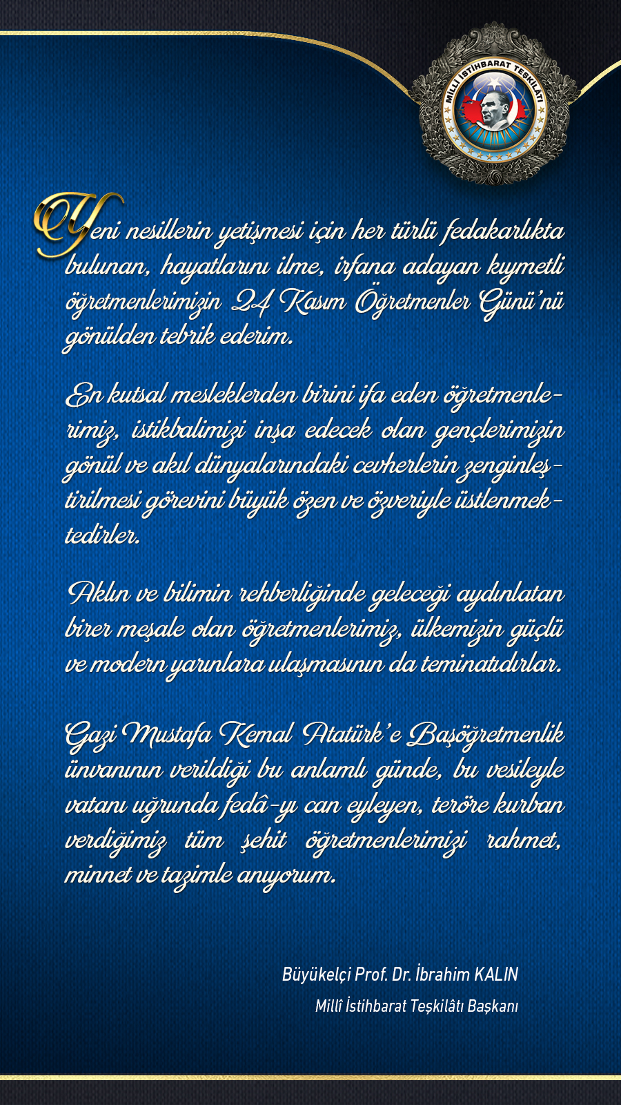 Sn. Teşkilat Başkanı Büyükelçi Prof. Dr. İbrahim KALIN'ın Öğretmenler Günü Mesajı